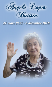 C’est avec tristesse que nous vous annonçons le décès de Mme Angela Lopes Batista, survenue à Montréal le 6 décembre 2018, à l’âge de 86 ans. Elle part rejoindre son frère Antonio et ses sœurs Héléna et Emilia.