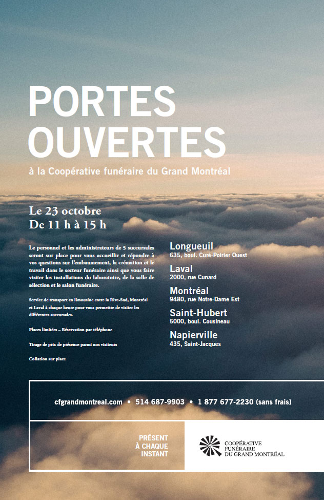 Cinq de nos centres funéraires (Laval, Montréal, Longueuil, Saint-Hubert et Napierville) ouvrent toutes grandes leurs portes le dimanche 23 octobre pour accueillir la population dans un cadre détendu et convivial. Le personnel et les administrateurs de la Coopérative seront sur place pour vous y accueillir et répondre à toutes vos questions. Cette activité se tiendra :