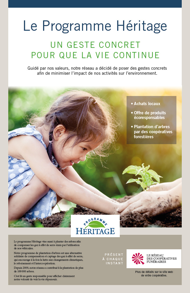 Le programme Héritage du réseau des coopératives funéraires du Québec vise à léguer un environnement plus sain en plantant des arbres à la mémoire des personnes décédées et en éliminant l’impact de nos activités sur l’environnement.