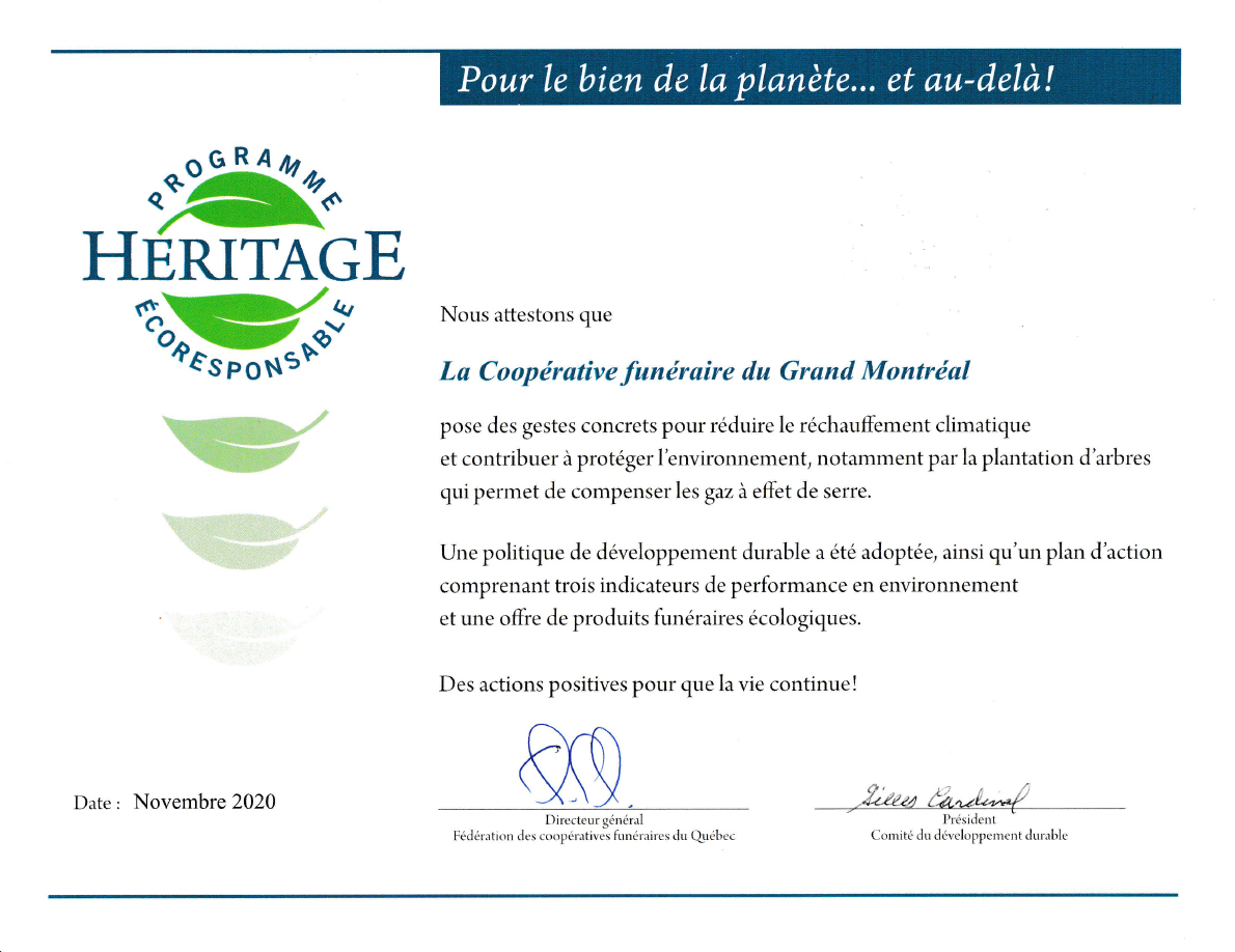 Au-delà du programme Héritage, la Coopérative funéraire du Grand Montréal mène plusieurs actions en faveur de l'environnement.