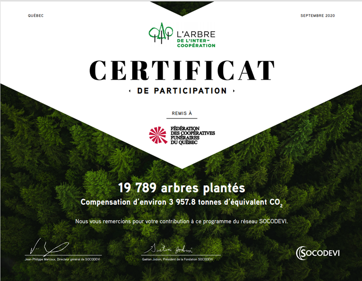 En collaboration avec SOCODEVI, le réseau des coopératives funéraires du Québec a procédé en juin 2009 à la première plantation d'arbres. Depuis cette date, à chaque année, la moitié des arbres sont plantés par la Coopérative forestière Ferland-Boileau du Saguenay et l’autre moitié par une coopérative forestière du Guatemala.