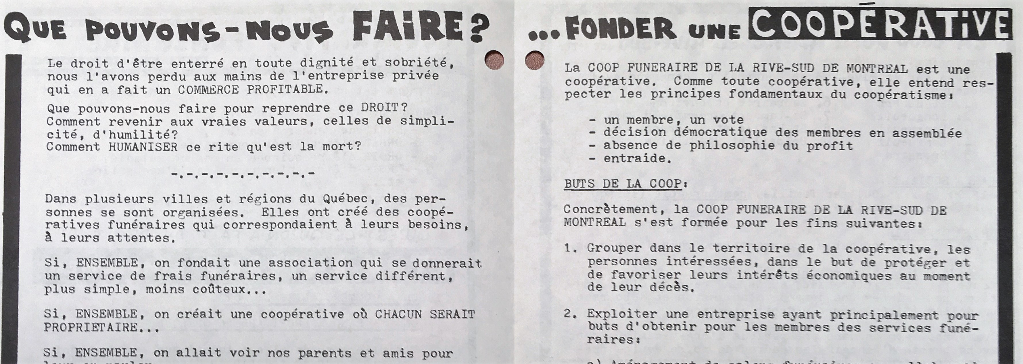 Dépliant promouvant la fondation d'une coopérative funéraire sur la Rive-Sud de Montréal - 1977